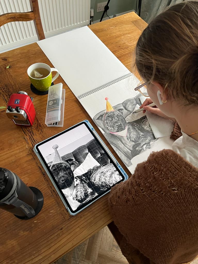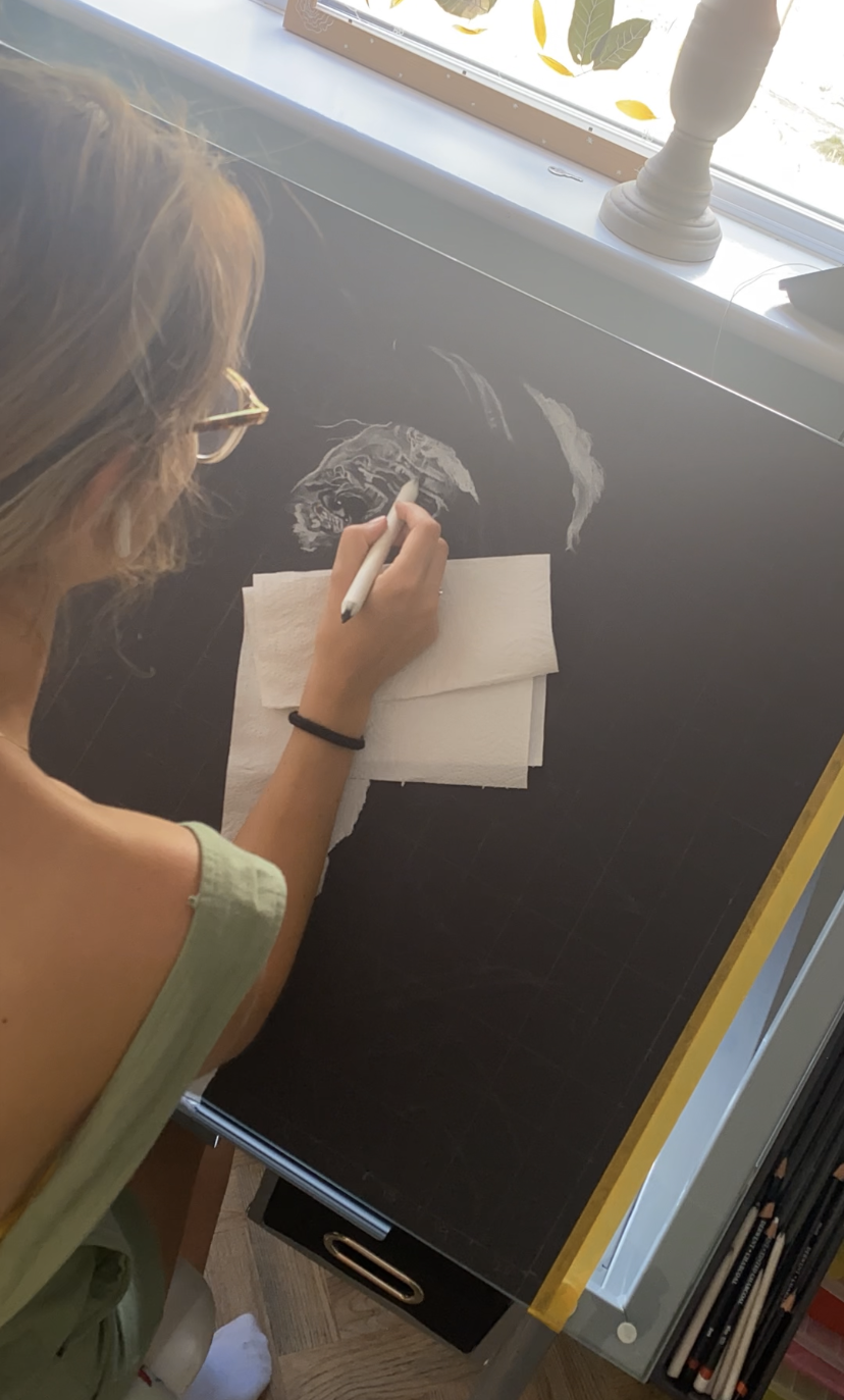 Typically, when I begin a realistic portrait I will grid the photograph that I am working from and then scale up to the canvas size. This takes time and precision so I can ensure that all of the proportions will be accurate and i can then purely focus on creating the subject. In some of my drawings you may see traces of the grid which I do not always like to completely erase as it was part of the process and is therefore engraved into the drawing. I usually begin the creative process with the eyes, the most crucial part of any portrait, in my opinion. It also helps that it is my absolute favourite feature to draw altough it does take a large chunk of time to perfect. Most of the subjects character is created from the eyes, the look they give, the emotion behind the eyes and they story they are expressing. From there, there is no normal order and I just feel my way through the rest of the portrait, often taking at least two weeks to fully complete.